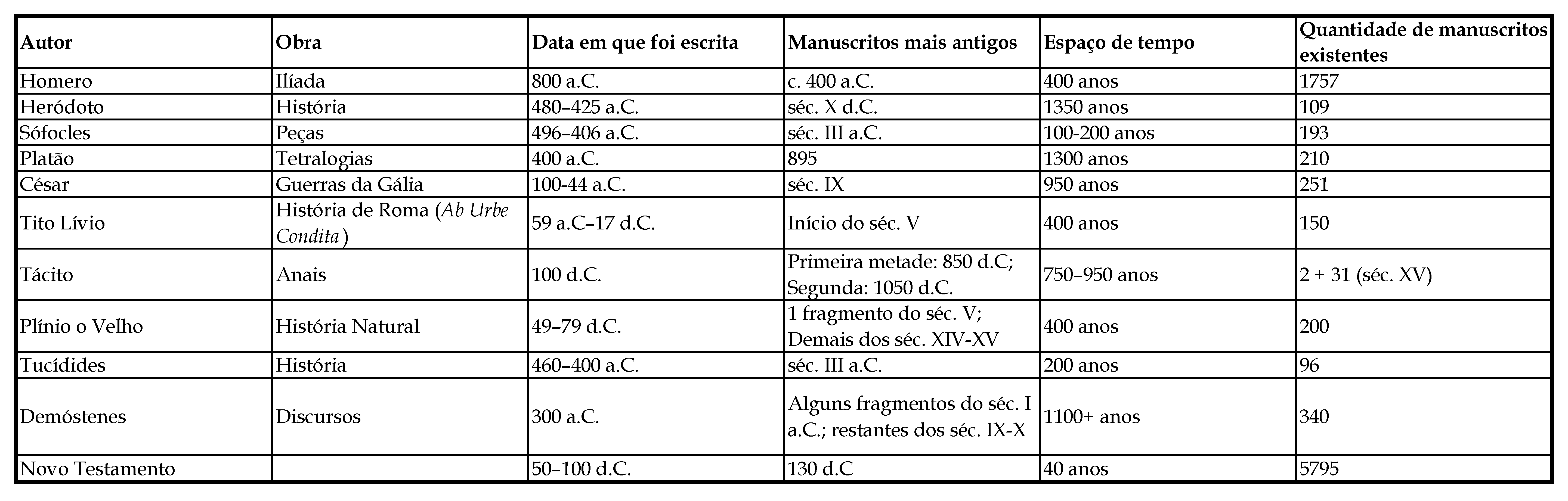 Apresentamos abaixo um estudo comparativo do Novo Testamento versus outros textos históricos, que leva em conta a quantidade de manuscritos existentes, bem como as datas de produção de cada artefato.
